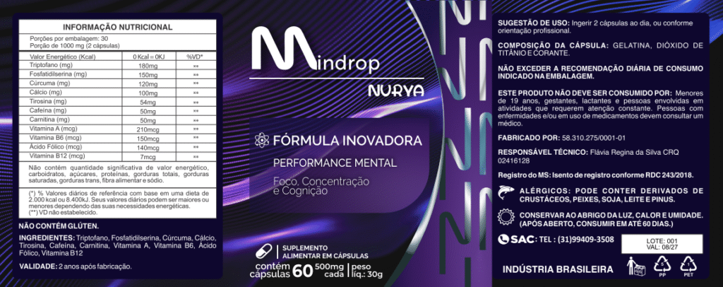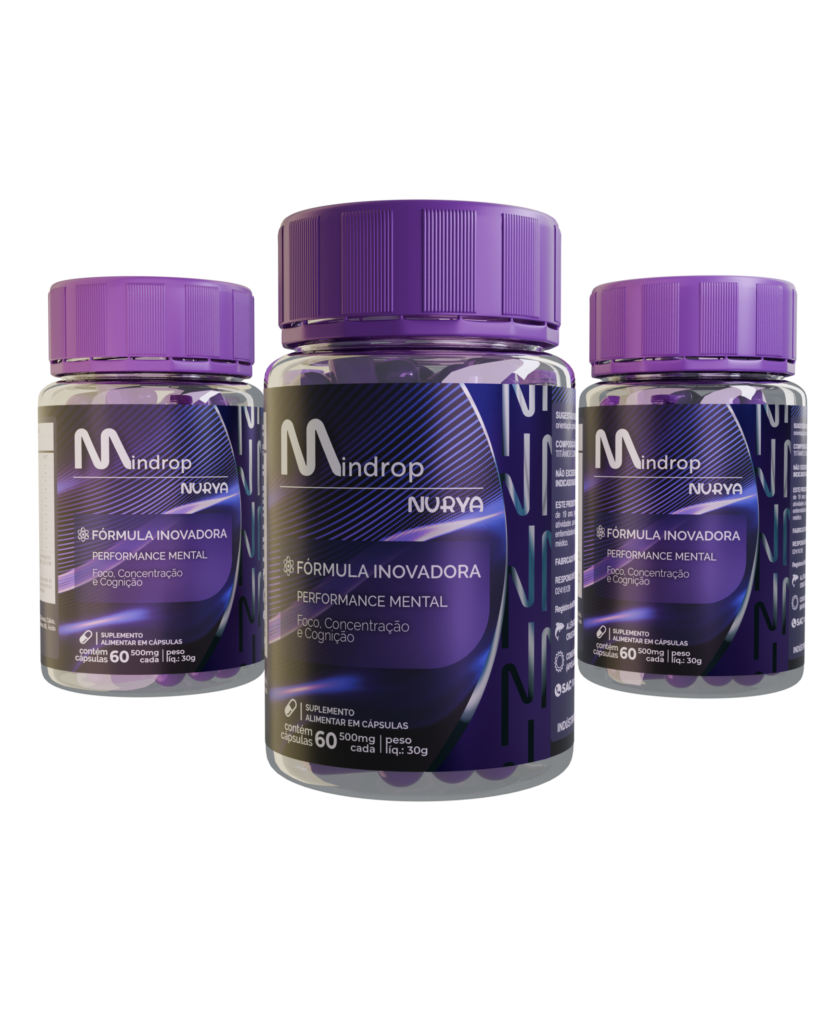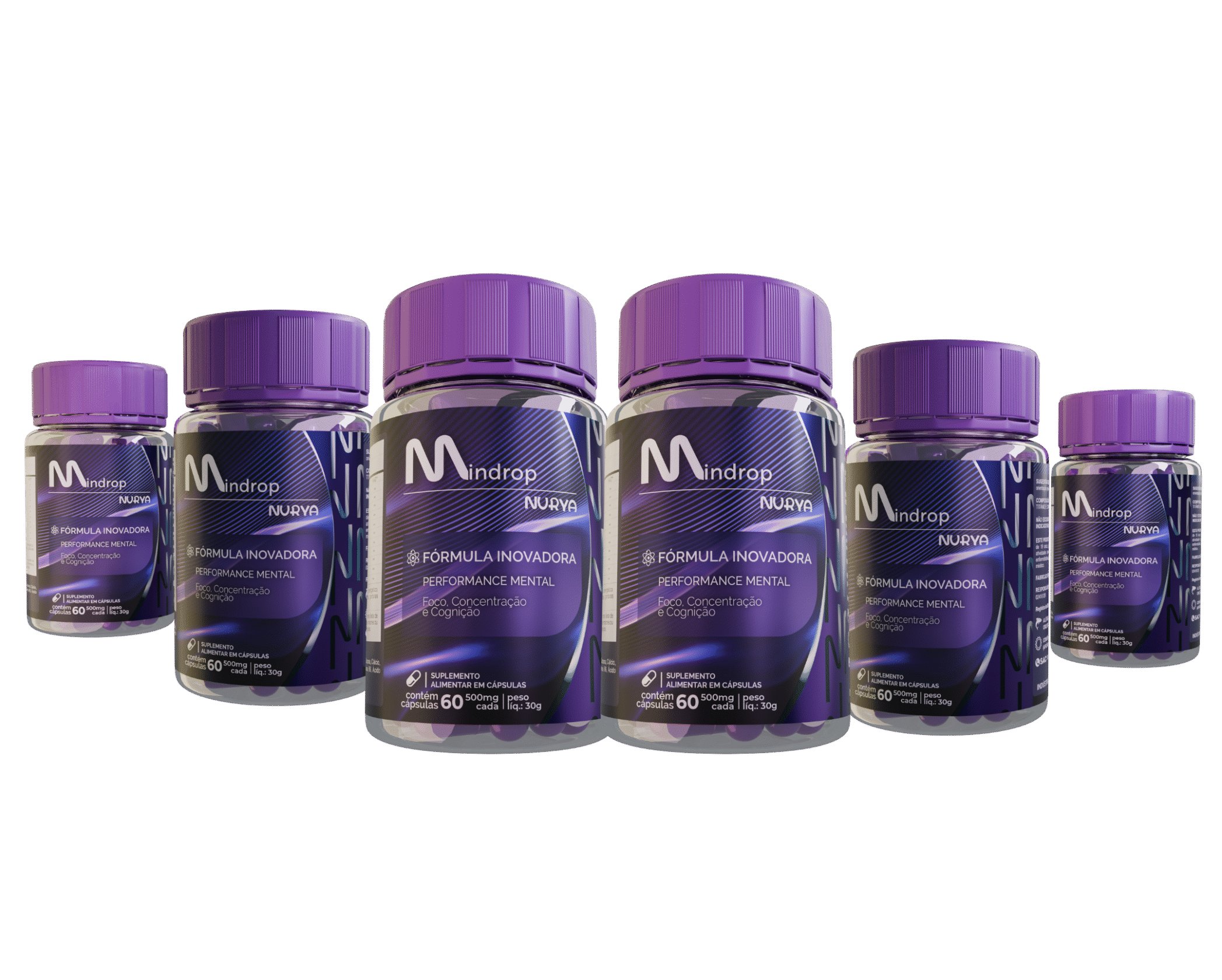 O Mindrop é o suplemento cerebral mais avançado do Brasil, fruto de nossa nova fórmula que une Fosfatidilserina, Tirosina, Triptofano, Vitamina A, Vitamina B6, Acido folico, Vitamina B12, Calcio, Carnitina, Cafeina, Curcuma em doses cientificas. Cada ingrediente foi selecionado para agir em sinergia, turbinar seu foco, reforçar a memória e manter sua concentração afiada durante todo o dia.